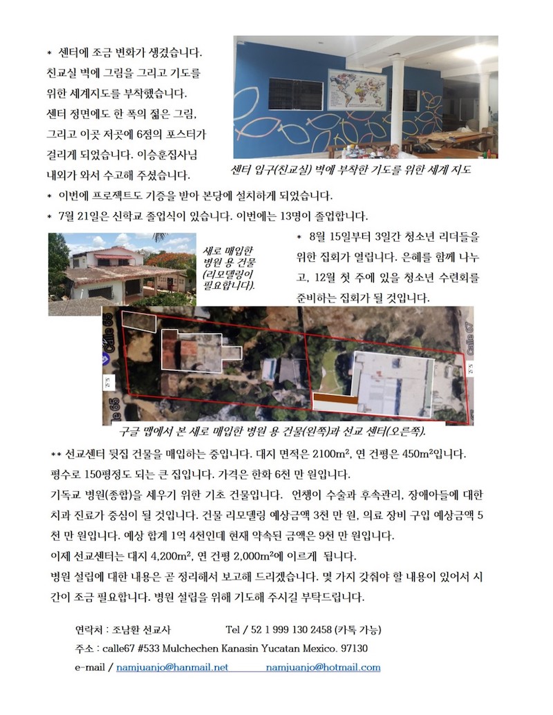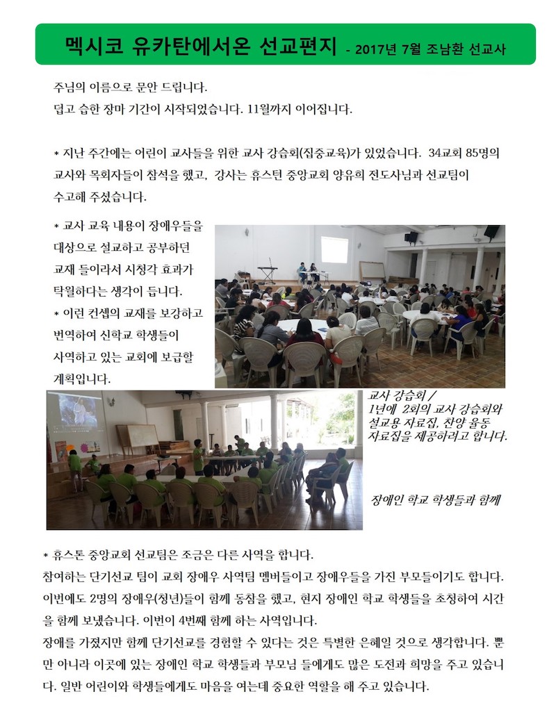 멕시코 유카탄에서온 선교편지 - 2017년 7월 조남환 선교사 Publish on July 26,2017 | 선교위원회 페이지 정보 작성자 선교위원회 댓글 0건 조회 5,910회 작성일 17-07-26 19:01 목록 본문 이전글늘찬양 선교단 소식 17.07.26 다음글몽골 선교답사 소식 17.05.30 댓글 0 댓글목록 등록된 댓글이 없습니다. 목록